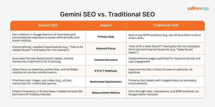 Unlike traditional SEO, which aims for top search result spots, Gemini SEO focuses on “zero-click” answers where users see your content without clicking away, but you still gain traffic from citations.