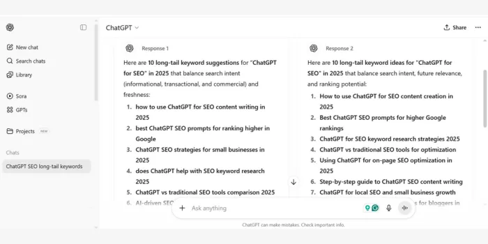 ChatGPT generates long-tail keywords like “ChatGPT SEO prompts 2025” quickly, uncovering niche opportunities.