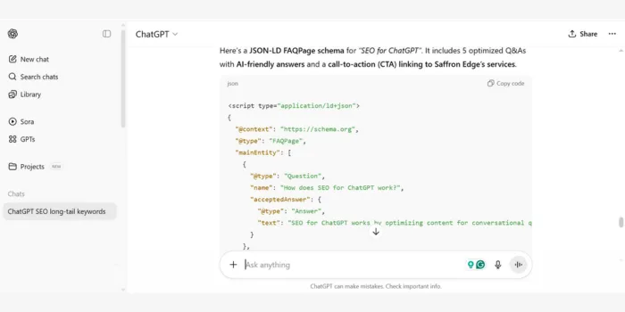 (Summarized): FAQ schema for “How does SEO for ChatGPT work?” with answer: “SEO for ChatGPT optimizes content for AI responses using conversational answers and schema markup, driving traffic. Visit Saffron Edge for more.”