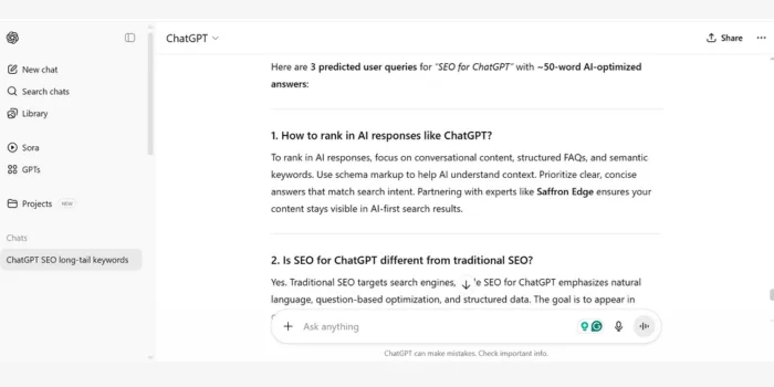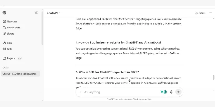 Best Prompt: “Generate 5 FAQs for ‘SEO for ChatGPT’ optimized for AI responses, targeting queries like ‘How to optimize for AI chatbots?’ Include a call-to-action for Saffron Edge.”