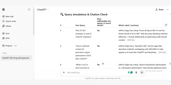 Best Prompt: “Simulate 3 queries for ‘SEO for ChatGPT’ (e.g., ‘Best AI SEO strategies?’). Check if saffronedge.com is cited and suggest improvements.”