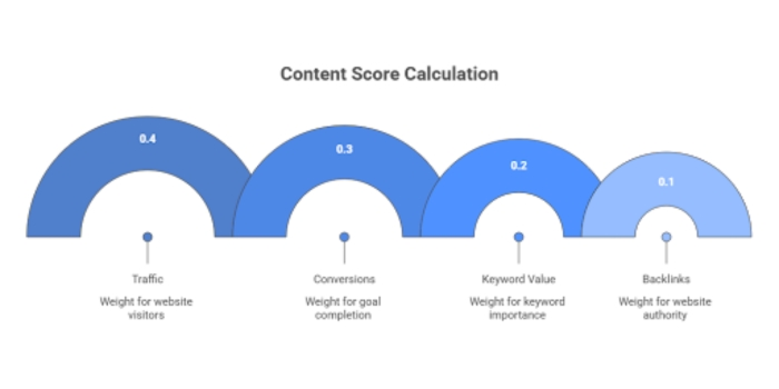 Content Score = (Traffic x 0.4) + (Conversions x 0.3) + (Keyword value x 0.2)+ (Backlinks x 0.1)